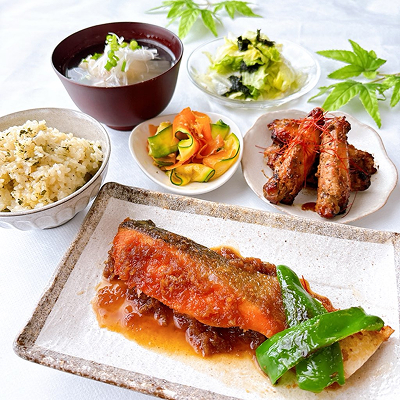 ・銀鮭の万能ステーキソース ・鯛の潮汁 ・鶏手羽焼き ・丸ごとレタス ・人参ズッキーニマリネ ・茶飯 ※都合により食材が変更になる場合があります