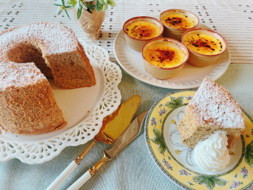 【はじめての方大歓迎♪】【ペア参加OK!】定番スイーツのコツを丁寧にお教えします。シフォンケーキは茶葉を生地に練り込んだ、紅茶の香りが広がる本格派。なめらかな口当たりのクレームブリュレはバーナーでパリッと香ばしく仕上げます。秋のティータイムにいかがですか?こちらのコースはお二人ひと組での参加も可能です(お二人で、お一人参加と同じ金額・作る量となります)。