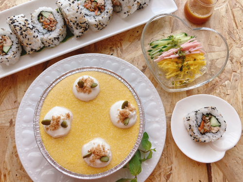 【はじめての方大歓迎♪】【ペア参加OK!】裏巻き寿司は見栄えも良く、食べ応え抜群の一品です。シナモン香るビスケット生地と濃厚かぼちゃのレアチーズケーキは、別添えのクランブルで食感の変化もお楽しみいただけます♪簡単に家庭で再現できるコツをお教えします。こちらのコースはお二人ひと組での参加も可能です(お二人で、お一人参加と同じ金額・作る量となります)。