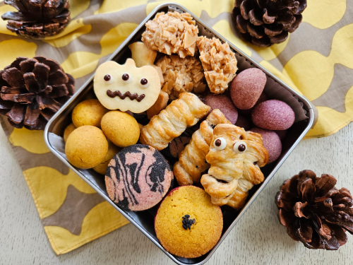 【はじめての方大歓迎♪】【ペア参加OK!】好評につき第二弾!今回はハロウィンバージョンのクッキー缶を作ります。かぼちゃ・紫芋・ブラックココアなど、色々な種類のクッキーが楽しめるハロウィンにぴったりなクッキー缶です。こちらのコースはお二人での参加も可能です(参加費・作る量はお一人で参加時と同じです)。