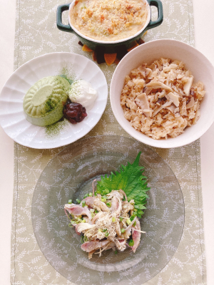 お一人3尾の魚をおろして、揚げ物とつみれ汁に仕上げていくレッスンです(アジ・サンマなどの季節の魚の予定です)。アーモンドミルクとシロップみかんで作るミルクプリンも添えていきましょう。白米はご家庭でご準備ください。