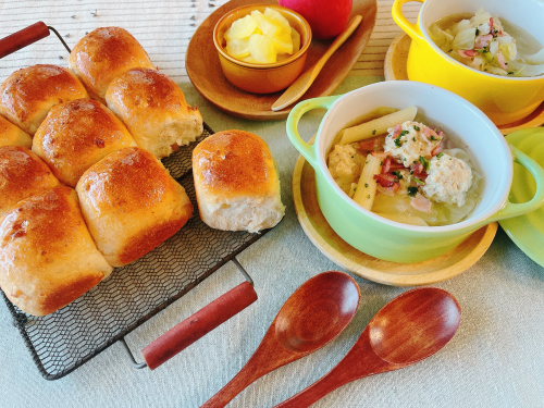 【はじめての方大歓迎♪】【ペア参加OK!】香り高いメープルの生地に、胡桃をたっぷり練り込んだちぎりパンをご紹介。旨味が凝縮されたチキンボールのスープ煮は、心も体も温まる一品です。自家製りんごのプレザーブは、パンやヨーグルトのお供にもおすすめです。こちらのコースはお二人ひと組での参加も可能です(お二人で、お一人参加と同じ金額・作る量となります)。