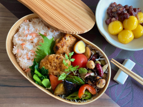 【はじめての方大歓迎♪】【ペア参加OK!】手作り鮭そぼろの混ぜご飯とお惣菜3品で彩り弁当を作ります。行楽にはもちろん、食卓で召し上がるのも気分が変わって楽しいですよ。簡易わっぱで2つのお弁当をお持ち帰りいただけます。生のかぼちゃで作るかぼちゃ白玉のぜんざいも添えていきましょう。こちらのコースはお二人ひと組での参加も可能です(お二人で、お一人参加と同じ金額・作る量となります)。